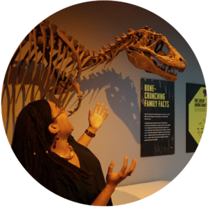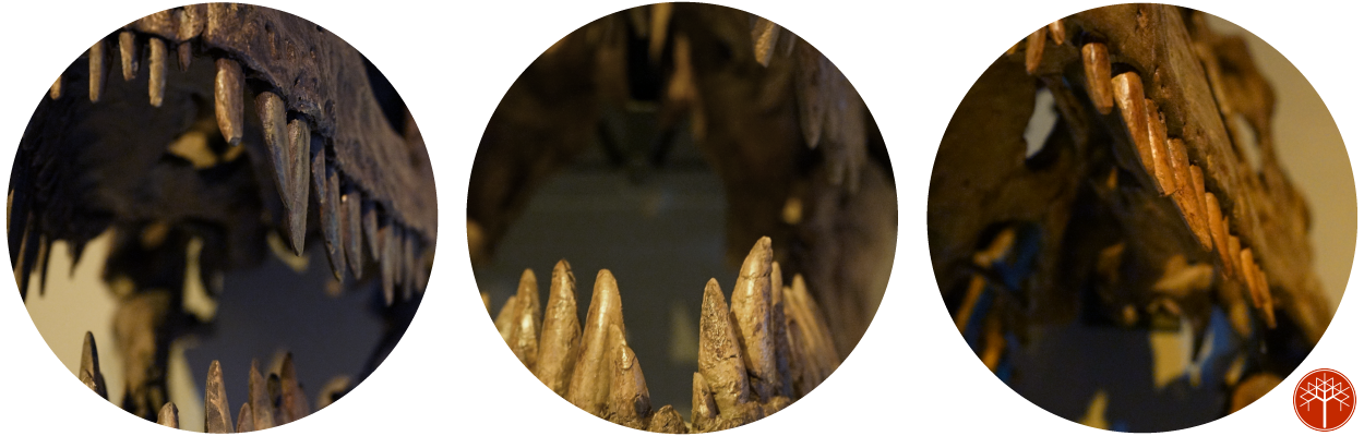 Regardless, morphology is one of the best tools at a paleontologist’s disposal and can be one of the most salient ways for non-scientists to identify species differences. The exhibition’s digital signage highlighted key structural differences between the tyrannosaur species on display. One wall presented the skulls of several tyrannosaurs and pointed out the specific differences in head width and shape, the presence of “horns” or crests, and the variations in teeth. Tooth shape is not only an important morphological trait, but it also gives scientists ecological information. Different teeth do different things, and paleontologists can get a sense of a tyrannosaur’s diet by examining the shape and orientation of the teeth.